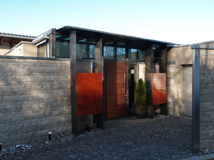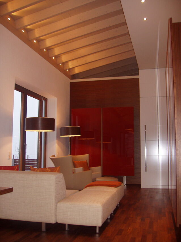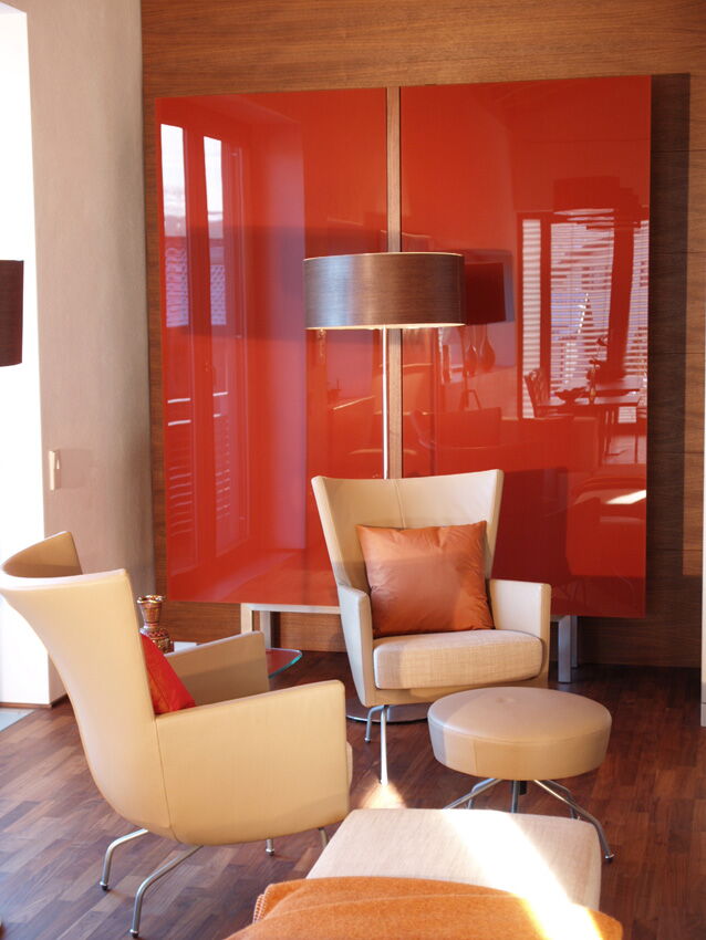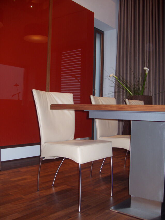 Im Einfamilienhaus der Familie Huber in Waldkirchen durften wir dank Frau Architektin Zeilberger die Glasarbeiten ausführen. Die korallenroten Glaselemente im Eingangsbereich unterstreichen den modernen Charakter des Hauses. Auch im Innenteil dominieren leuchtend rote Elemente, wie die Glasrückwand in der Küche und die Schrankfronten im Wohnbereich.